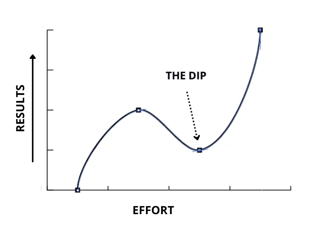 Sometimes, admitting that something isn't likely to work and choosing a different path early on is the most courageous thing you can do. The concept of "the Dip," as explained by bestselling author and marketing guru Seth Godin, is particularly useful. The Dip is the difficult period in any worthwhile pursuit when initial excitement gives way to obstacles, slow progress, and frustration. Most people give up at this point, but Godin argues that those who push through the dip ultimately succeed. The Dip acts as a filter. If the goal is meaningful, persevering leads to exponential rewards.